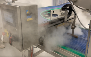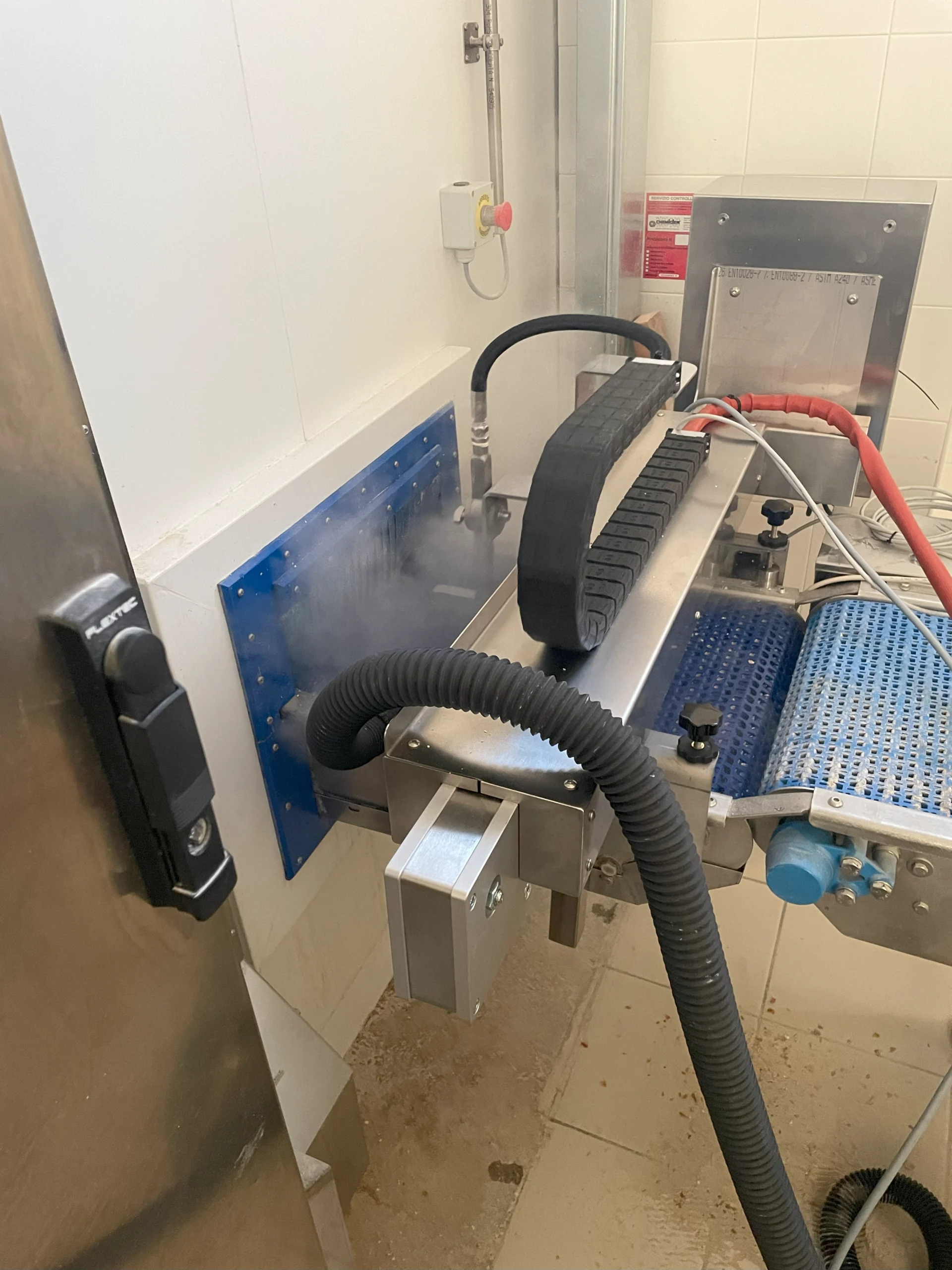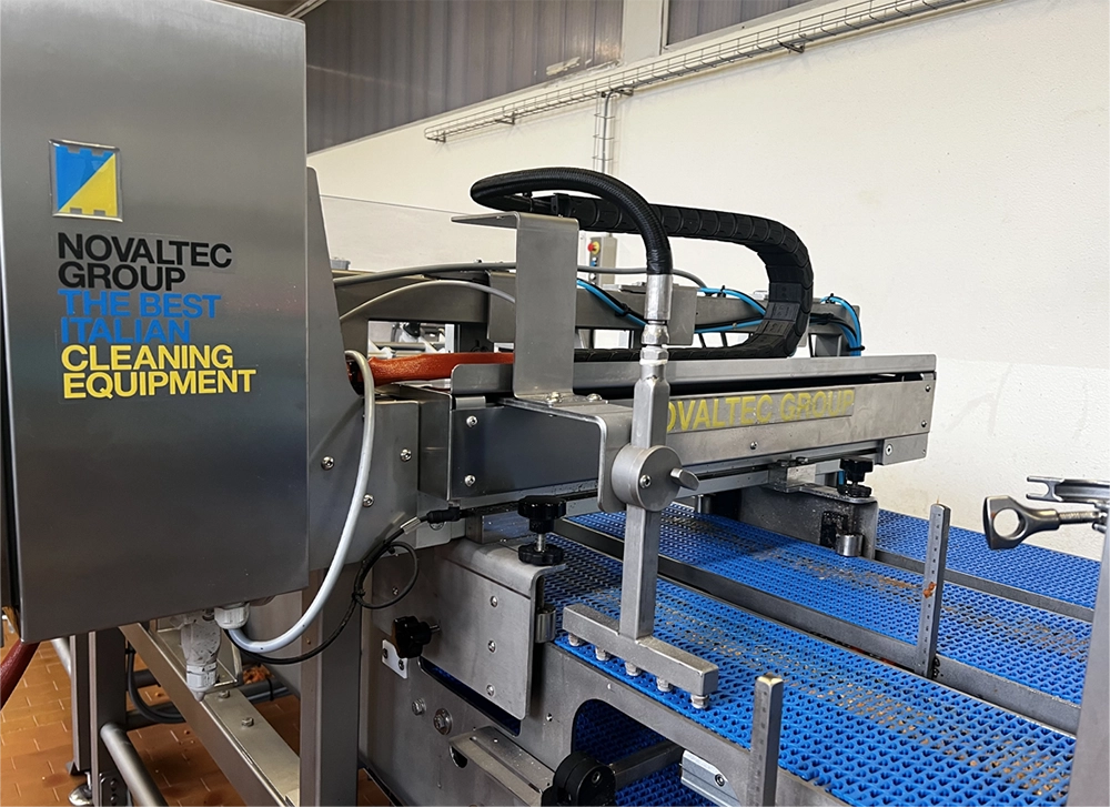 The Robo-Steam automatic belt cleaner allows for fully automated modular belt cleaning. This professional belt washer is composed by an aluminium and stainless steel frame and a 7″ control panel to set different parameters such as belt length, speed, sector numbers, etc.